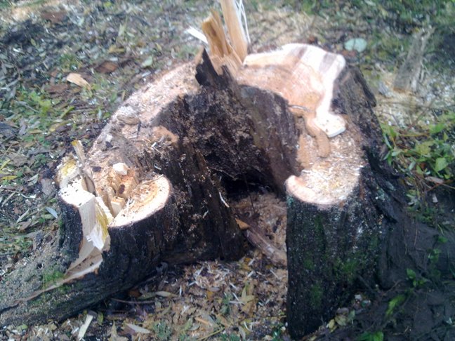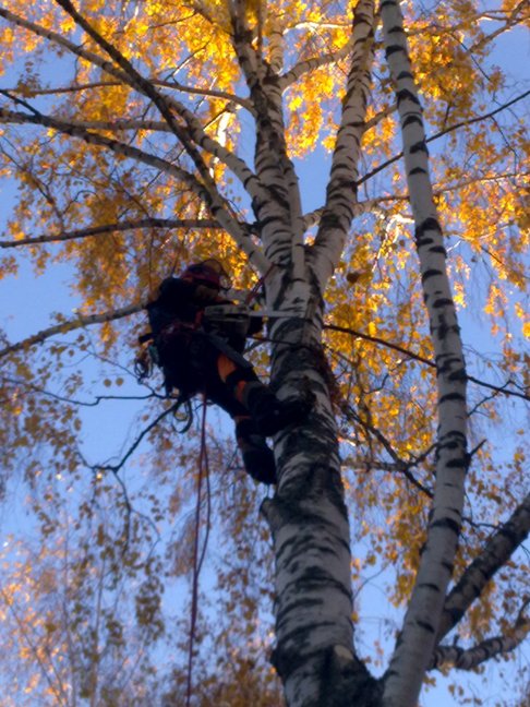 Pälkäneellä kantojen jyrsintää ja pihapuiden kaatoa 28.10.2013 Vanhan koivun poisto ahtaalta pihalta. Arboristi laski oksat maahan köyden avulla yksi kerrallaan.